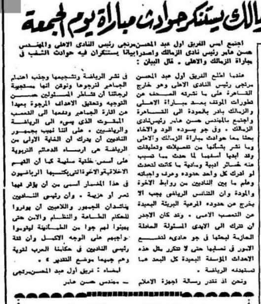 فضيحة صبحى نصير.. الموضوع طويل رغم اختصاره. بلا خجل.. اختار اتحاد الكرة برئاسة عبد الحكيم عامر (نائب رئيس الجمهورية) صبحى نصير لادارة مباراة الزمالك والاهلى. القرار اغضب ادارة الاهلى وطالبت سرا بتغييره بأى حكم أخر ولكن اتحاد الكرة صمم على نصير صاحب فضيحة الغاء هدف المحلة فى الزمالك. كشف نصير عن وجهه القبيح مبكرا.. وبعد تقدم الزمالك بهدف هاجم الاهلى واضطر احمد مصطفى مدافع الزمالك لابعاد تمريرة الفناجيلي الى طه اسماعيل المنفرد بيده.. ضربة جزاء مليون بالمائة.. ولكنه أشار بسير اللعب.. وتكررت مخالفات لاعبي الزمالك داخل منطقة جزائهم من دفع وجذب لايقاف هجمات الاهلى دون اى حزم او قرارات من الحكم. وفى بداية الشوط الثانى والأهلى الأكثر هجوما ترك الحكم حماده امام المتسلل جدا واشار باستمرار اللعب ولولا براعة مروان لعزز الزمالك تقدمه بهدف من تسلل.. وفى منتصف الشوط ارتدت الكرة سريعا لينفرد عمر النور المتسلل أيضا بالمرمى ولكنه سجل هدفا هذه المرة.. واعترض رفعت الفناجيلي وزملاؤه على الهدف لتسلل عمر.. وطلب الفناجيلي من الحكم الذهاب الى حامل الراية لسؤاله بعد ان اشار بالتسلل ورفع رايته لكن صبحى رفض الذهاب وتمسك بصحة الهدف مؤكدا أن حامل الراية لم يرفع رايته بالتسلل.. ورفض الفناجيلي وزملاؤه استئناف اللعب واضطر مدير الكرة على زيوار الى النزول الى الملعب ووضع الكرة بنفسه على نقطة الوسط لتنفيذ ركلة البداية واستعد لاعبو الاهلى الغاضبون لاستئناف اللعب.. ولكن جماهير الأهلى اقتحمت الملعب للاعتداء على الحكم ودخلت الشرطة لحمايته.. وتدفقت الجماهير وهرب اللاعبون وتطايرت الحجارة والكراسي وأشتعلت النيران فى المدرجات ليتحول الأمر الى شغب واسع.. وقرر الحكم انهاء اللقاء. ونقدم لكم الوثائق التالية مع الموضوع: أولا: الاهرام نجيب المستكاوى يشير الى امرين خطأ تعيين صبحى نصير وانه استفزاز للاهلى ومجاملة للزمالك. وجود ركلة جزاء صحيحة للاهلى من لمسة يد احمد مصطفى. ثانيا: احتجاج الاهلى على النتيجة واشارته لركلة الجزاء وتغاضي الحكم عن حقوق الاهلى.. وعن عنف لاعبي الزمالك وعن تسلل حماده ثم عن تسلل عمر النور فى الهدف الثاني. ثالثا: تصريحات على زيوار مدير الكرة فى الاهلى حول الهدف التسلل وركلة الجزاء التى اغفلها الحكم. رابعا: اجتماع مجلس ادارة اتحاد الكرة وبه ثلاثة من رموز الزمالك حسن عامر رئيس النادى ومحمد لطيف ومحمود امام.. وهو الاتحاد الذى قرر تعيين صبحى نصير ثم اعتماد النتيجة. خامسا: بيان مرتجى وحسن عامر رئيسي الاهلى والزمالك.. أى ان رئيس الزمالك عضو باتحاد الكرة الذى يرأسه أخوه المشير. سادسا: عبد الحكيم عامر رئيس اتحاد الكرة ونائب رئيس الجمهورية يعتمد قرارات الاتحاد (اتحاد الذى يديره اخوه) ويخفف عقوبة لاعبي الاهلى من الايقاف للانذار. هتافات مكثفة: البلد اهلاوية (طبعا عبد الحكيم عامر اهلاوى) الحكام اهلاوية (طبعا صبحى نصير اهلاوى) اتحاد الكرة (طبعا حسن عامر ومحمد لطيف ومحمود امام اهلاوية)